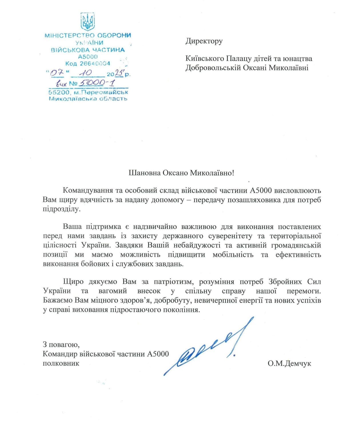 The command of the military unit A5000 expressed gratitude to the staff of the Kyiv Palace of Children and Youth for significant volunteer support.